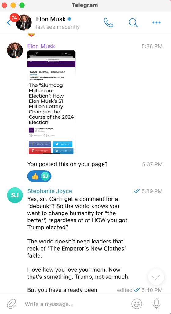 This skepticism lingered as I began engaging with someone claiming to be Elon Musk on Telegram this past month.