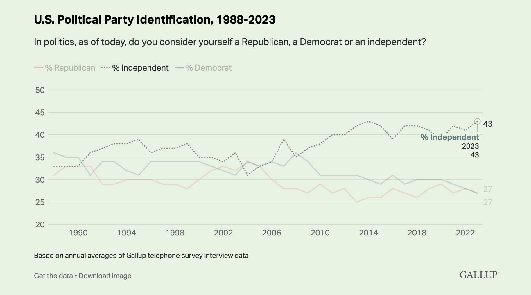 Here is a chart provided by a Gallop poll on the latest polled statistics on independent voters: